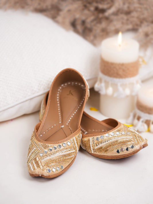 Adorned with dazzling mirror work, glimmering gold cut dana and delicate pearls, these juttis offer a radiant touch to any ensemble. A perfect harmony of intricate design and supreme comfort, these juttis are the epitome of timeless beauty and sophistication.