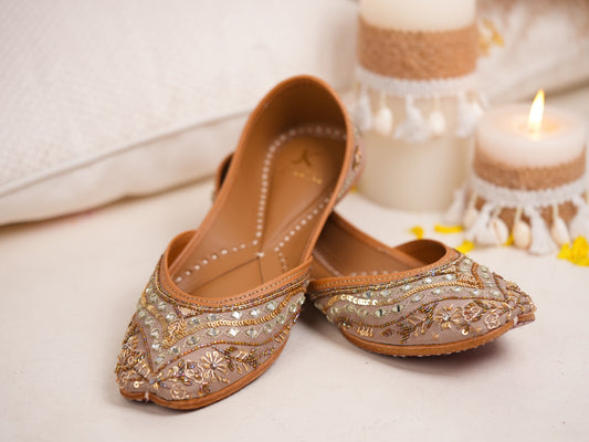 Radiate warmth and elegance with our handcrafted mustard yellow juttis, where rich color meets intricate artistry. Covered in stunning zari work from heel to toe, each pair is a masterpiece that celebrates the beauty of traditional craftsmanship with a modern twist.